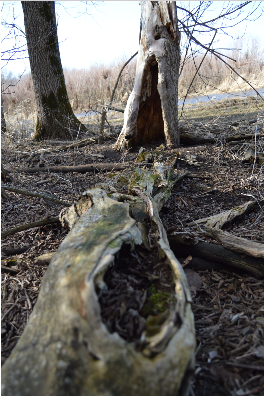 I clambered over and around decaying trees. Munch maws being fed upon, unable to run, held in silent screams.  Above me, high winds pushed branches together, creaking and cracking, threatening to drop on me, and the dying trees below. I stumbled into a clearing, sinking into wetlands. I looked up and raised a hand against the Sun; shielding my eyes so I could see it again. It moved deep into a sun that blinded me, splitting into broken pieces of stain glass, cutting my day into tumbling, rhombi that rolled out of a blue sky, all white and yellow, edges of sapphires; puzzles in the air.  I watched it play around the light, to settle on top of the tallest tree.  It watched me, making my mark in muck; it watched me point my lens.
