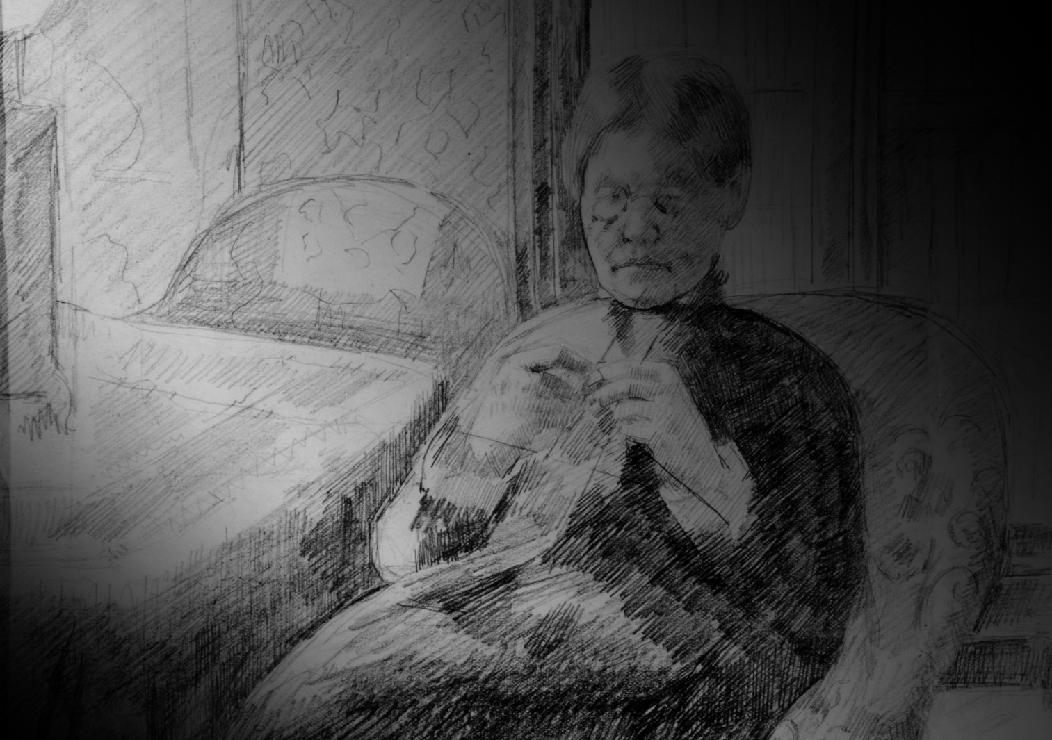 Light through a gap in the heavy drapes fell on the old woman. The floral print armchair she sat in engulfed her slight figure. Except for the click of the knitting needles in her gnarled hands, she was quiet and very still. Her lips moved, but no sound came from them. She might have been sitting there for an hour, a day, or much longer. Judging by the length of the piece she was knitting, she'd been at it a long time.