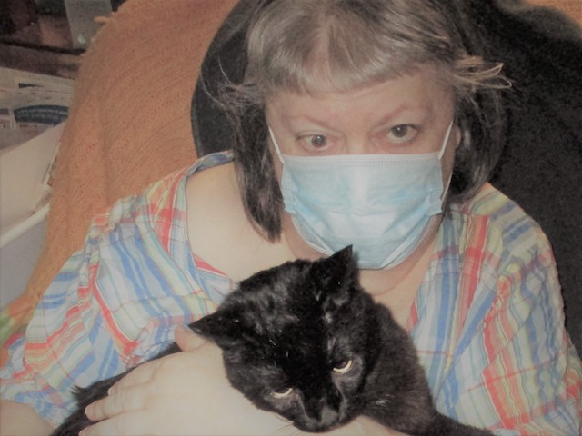 Ebony cat leaps onto her lap,